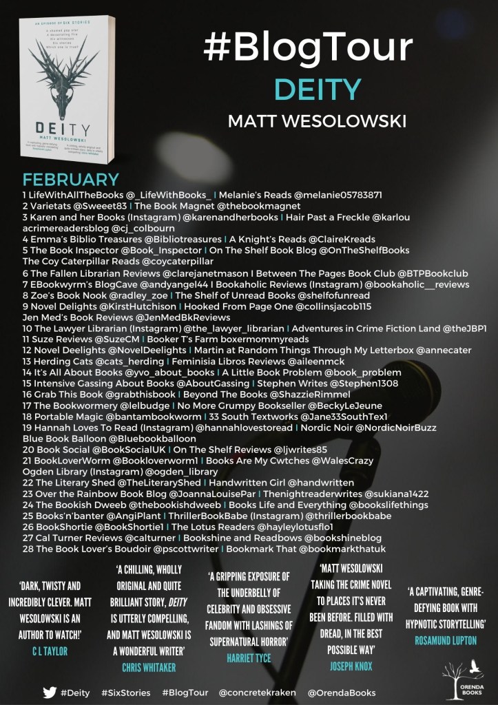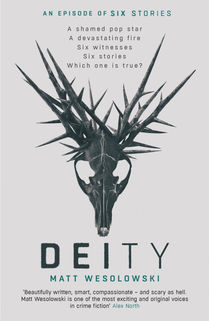 I am a huge fan of the Six Stories series and every one I have read has been brilliant – Deity is absolutely no exception. The format is the same as all the others in the series – we get six points of view on the same mystery in the form of a podcast. In Deity the mystery surrounds pop superstar Zach Crystal and the rumours surrounding his life and death.